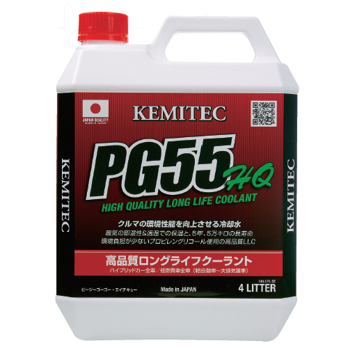 PG55 HQ(HIGH GUALITY)高性能な純水とプロピレングリコールが主成分で、それに加えてロングライフを実現する「M.A.Iリキッド」という独自開発の添加剤を加えた高品質ロングライフクーラント(LLC)です。プロピレングリコールは、食品や化粧品にも使われる液剤なので、環境や人体への影響がすくなく、加えてエチレングリコールより、熱吸収と放出性も優れています。さらに、液体粘度も低いので流れの抵抗が少なく、キャビテーションも起こりにくいのが特徴です。