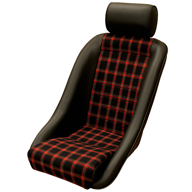 ポルシェ356の後継モデルとして発表された「901 シャシー#57」に採用されたペピータ(ペピタ)パターンシートをモチーフにした「千鳥格子柄」に加え、'74~のビッグバンパー期の内装に見られた「タータンチェック柄」をラインナップ。千鳥格子柄と同様、ヘッドレスト・サイド・背面のブラックレザーは合皮です。