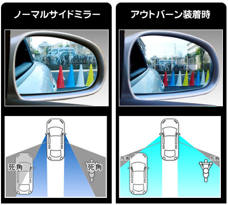 アウトバーンは、ミラー部分を曲面状にして純正のミラーより死角をなくし、安全性を飛躍的に向上させる革新的広角ドアミラーです。車線変更や高速道路での合流、車庫入れなどのバック時に純正ミラーと、アウトバーンの映り込みが全く違います。夜間後方からのヘッドライトビームの眩しさを防ぐ防眩加工も施されています。